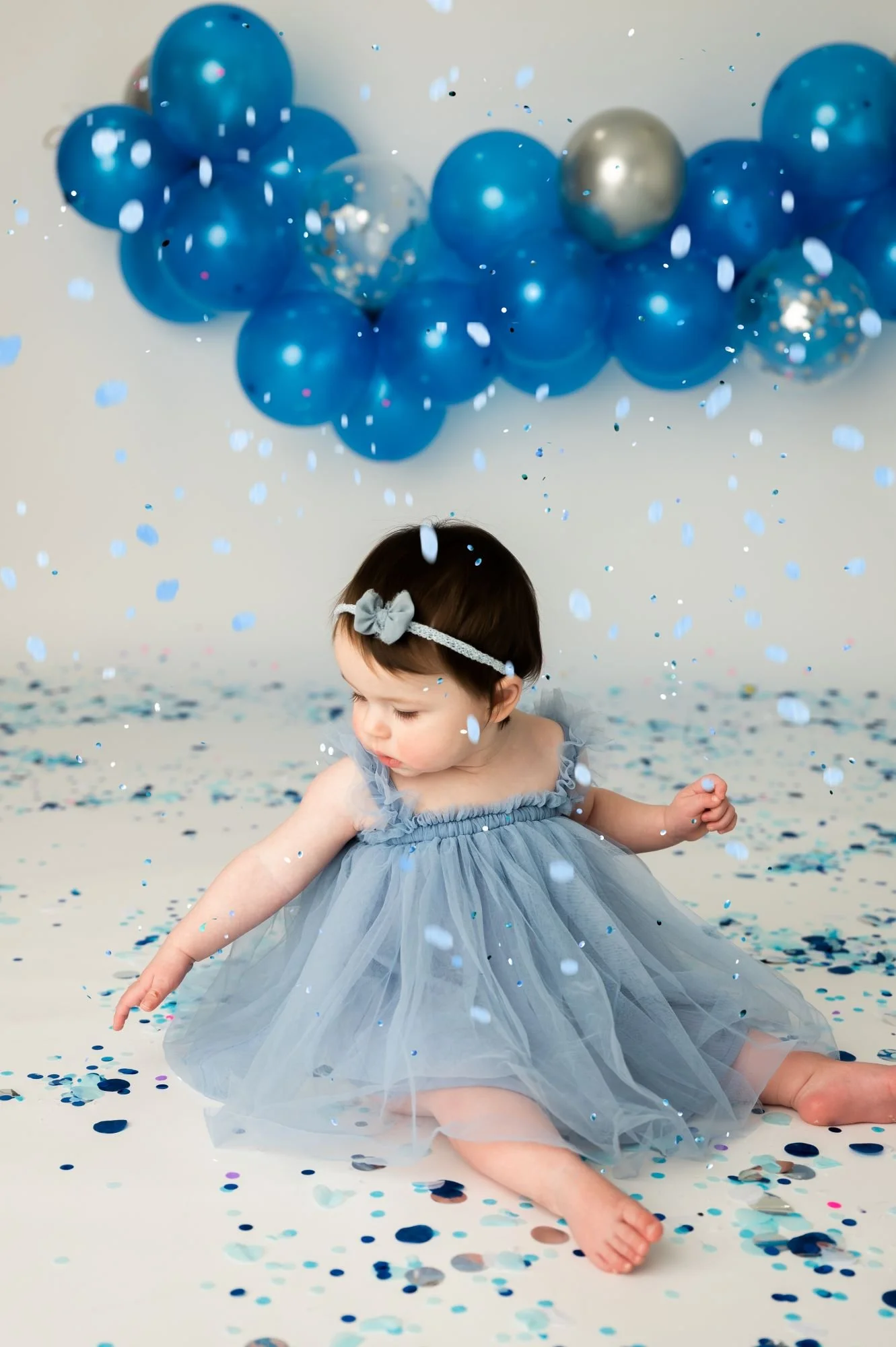 Glitter photoshoots aren’t just for girls! These two brothers had a blast tossing blue, multi shades confetti with a blue balloon background!