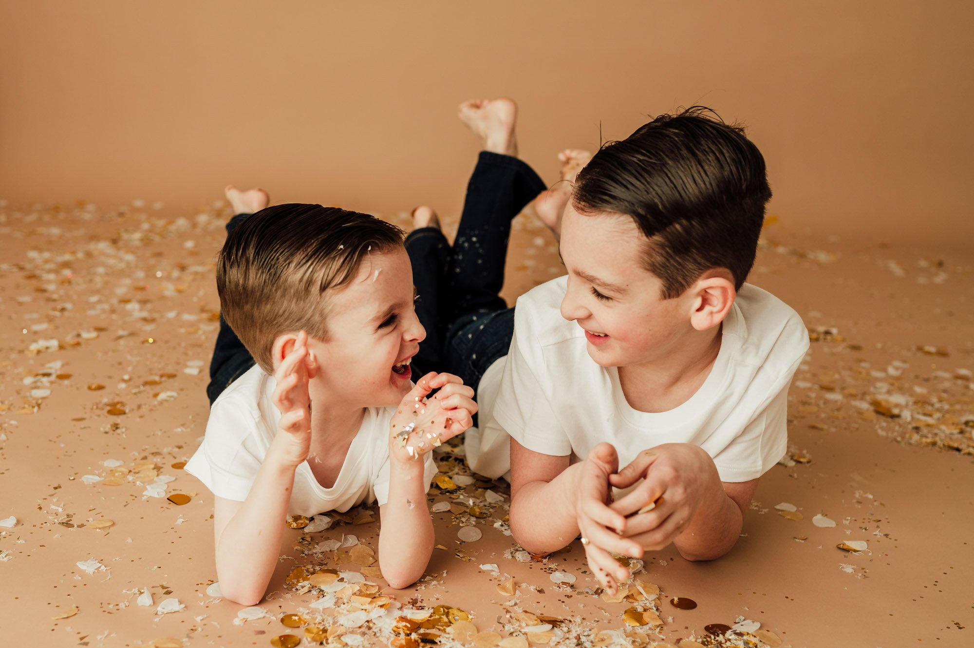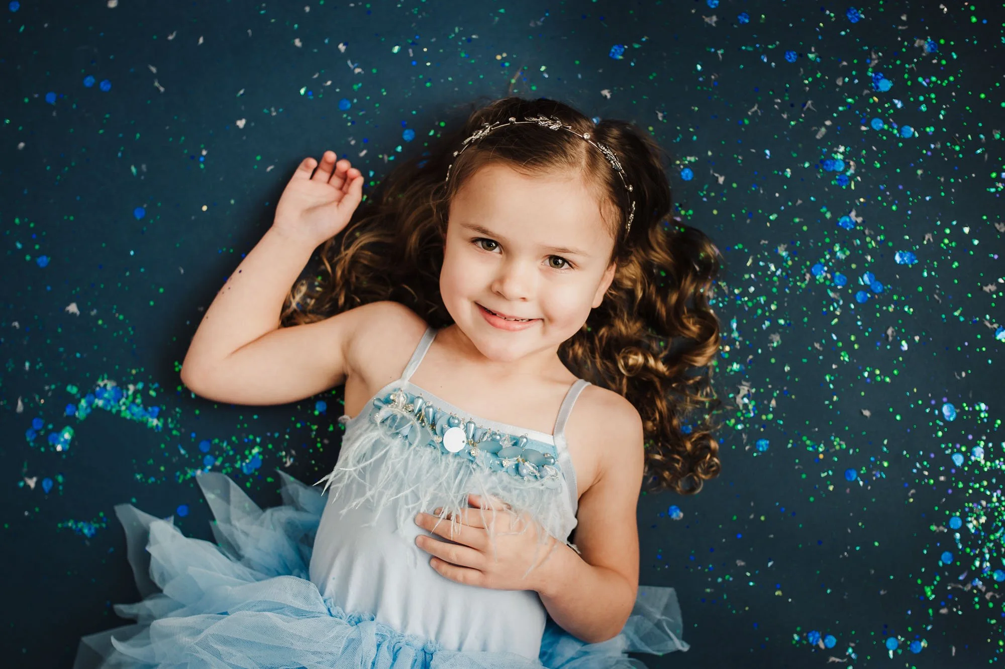 This pose creates the sweetest, most peaceful moments. Have kids lay comfortably on their backs and look straight up toward the lens, letting their face relax naturally. Place glitter or confetti all around them so it is set. I DO NOT recommend dropping any over their faces as it is important to keep the glitter out of their eyes.
