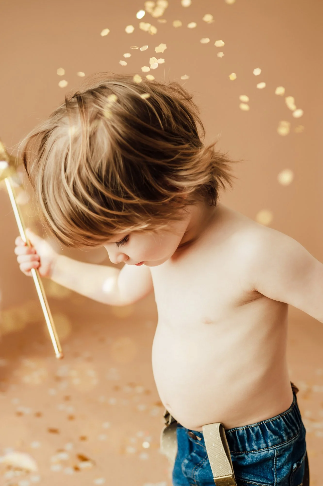 Mom brought this little guy in blue jeans and suspenders for his whole session. It went perfect with the deep gray backdrop and colorful gold glitter.