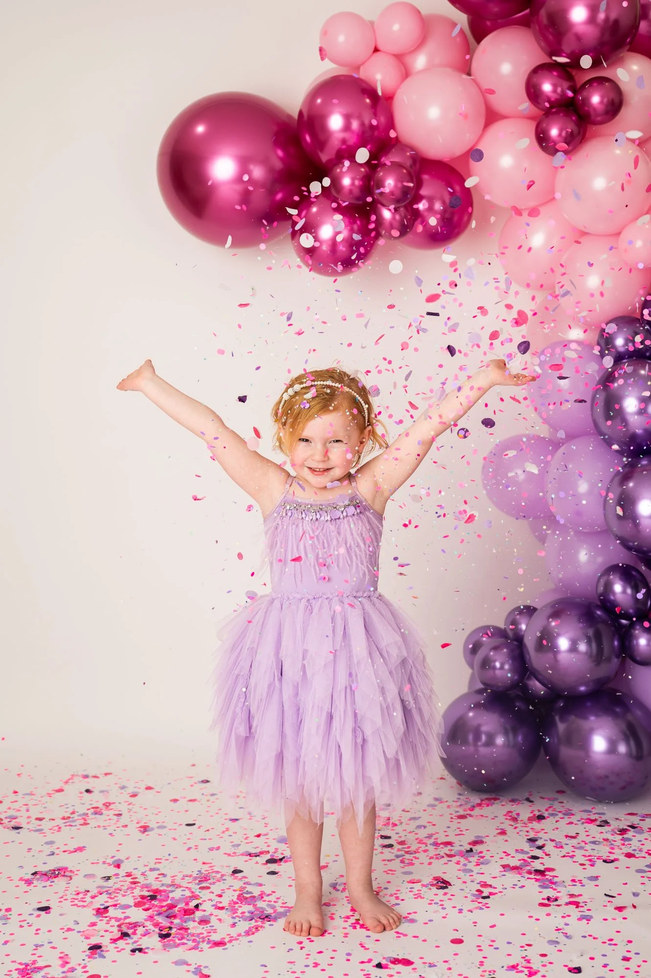 Ask the parent to throw slowly and from a little higher up so the confetti has time to float and fall. Encourage kids to look up, close their eyes, or reach for the sparkles as they come down. This pose feels playful and relaxed and it captures those joyful, in-the-moment expressions beautifully.